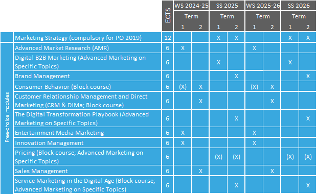 - (X) = Courses generally extend over the first and second term of a semester. Please check the respective course sites for exact schedules.