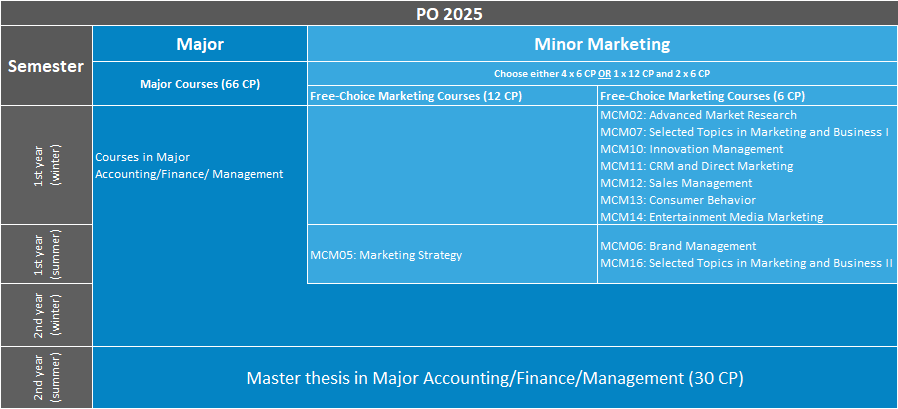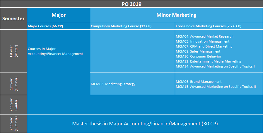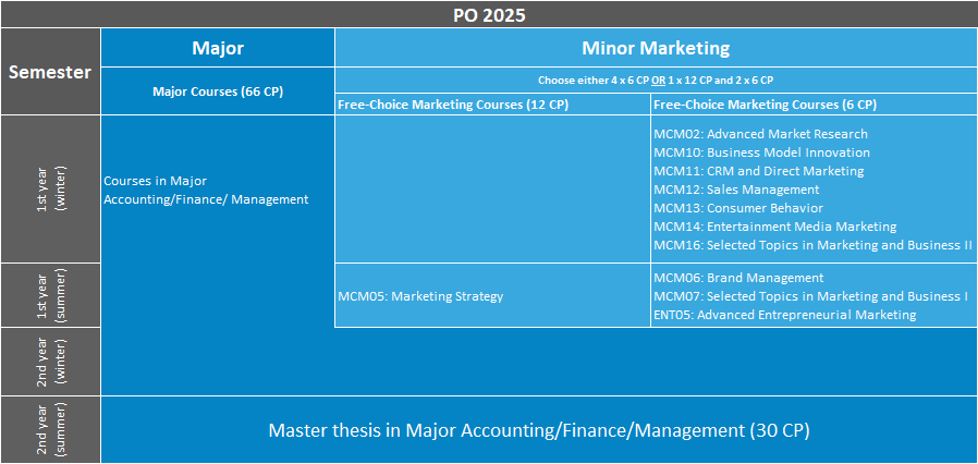 The following diagram provides an overview of the courses on offer for students minoring in Marketing. Unforeseeable circumstances may necessitate changes (effective: August 25, 2021).